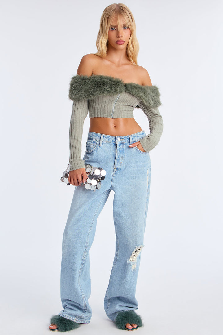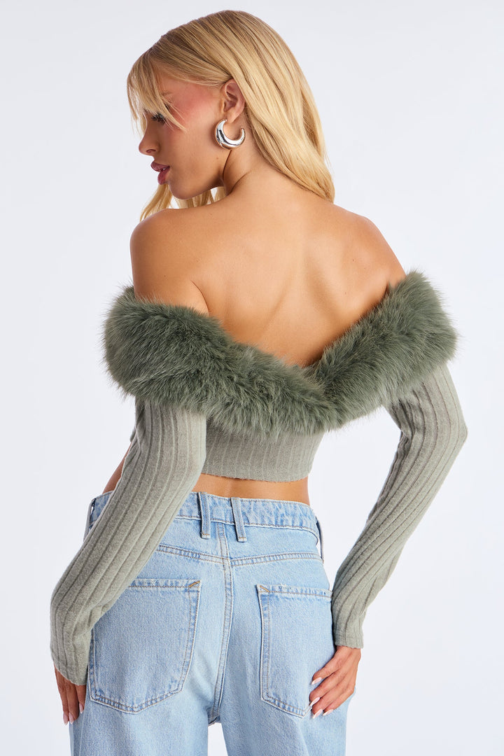Break It Up Faux Fur Trim Off Shoulder Top - Sage