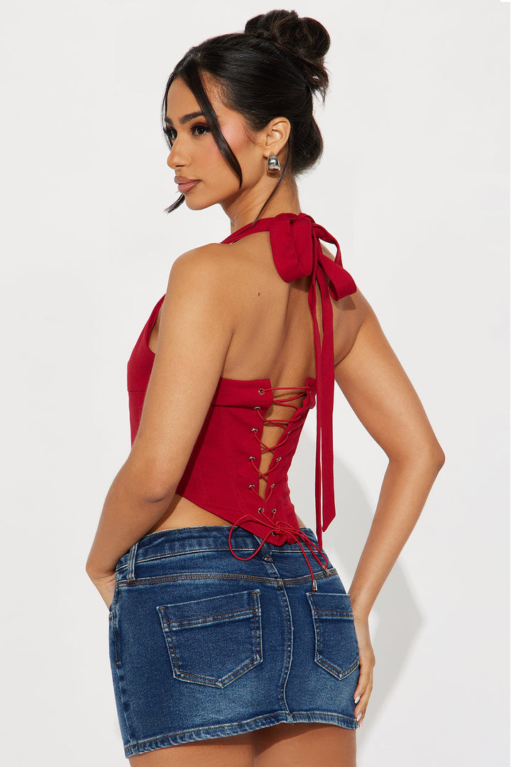 Available In Black And Red. | Corset Top | Halter | Tie Neck | Lace Up Detail | Boning | Back Lace Up Detail | Cropped | Stretch | 62% Rayon 33% Nylon 5% Spandex Lining: 95% Polyester 5% Spandex | Imported