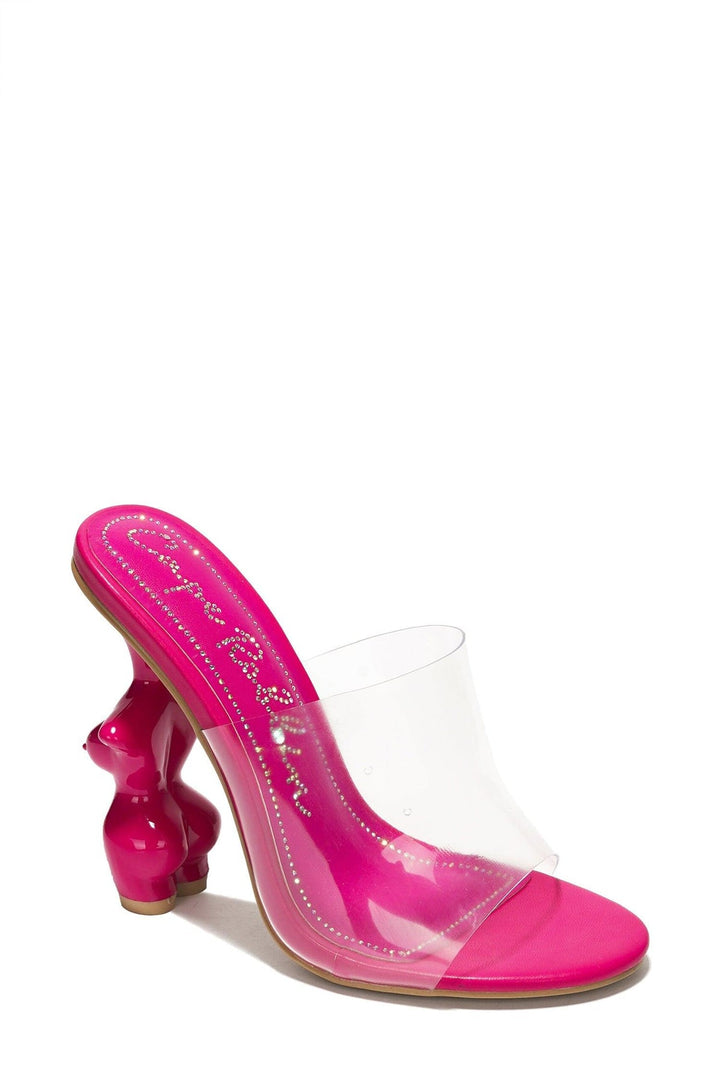 BRIDIE - PINK - HEELS by CAPE ROBBIN Odd Shape Heel: 4 inch Slip On PU leather insole with memory foam cushioning Open round toe Rhinestone embellished logo Elegance meets artistry! Designed to turn heads,these heels feature a unique heel shape inspired by the graceful female form,adding a touch of sensuality to your every step. Step into sophistication and style with Bridi Heels and let your footwear do the talking.