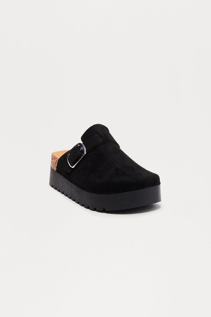 Available In Black. | Causal Slides | Buckle Detail | Round Toe | 1" Platform | Imported