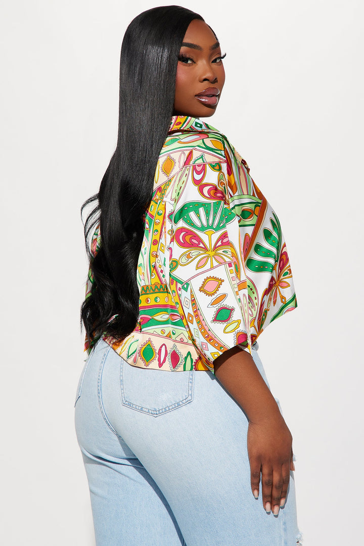 Available In Green/combo. | Satin Shirt | Short Sleeve | Button Down | Collar | Printed | Cropped | Non Stretch | Disclaimer: Pattern Placement May Vary. | Self: 100% Polyester | Imported