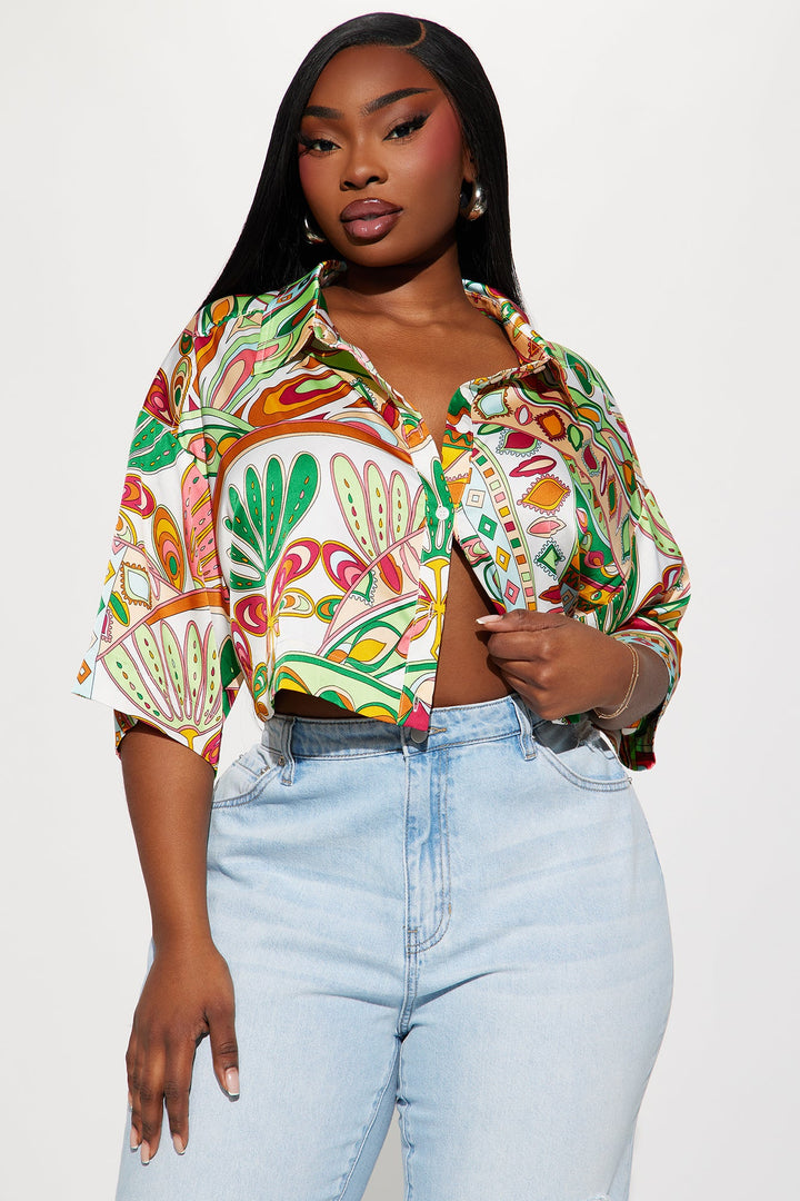 Available In Green/combo. | Satin Shirt | Short Sleeve | Button Down | Collar | Printed | Cropped | Non Stretch | Disclaimer: Pattern Placement May Vary. | Self: 100% Polyester | Imported
