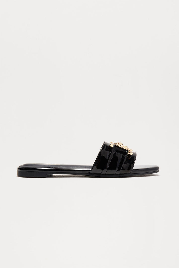 Available In Black. | Flat Sandals | Hardware Detail | Square Toe | Flat Heel | Imported