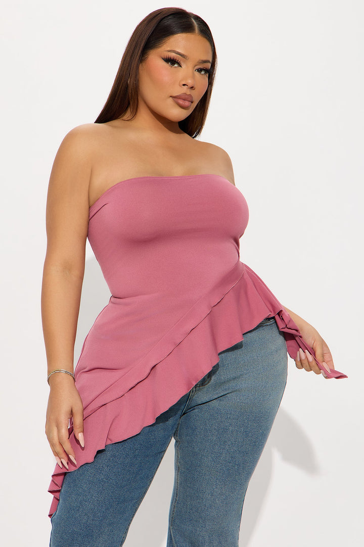 Available In Black And Rose. | Asymmetrical Top | Strapless | Ruffle Trim | Stretch | 95% Polyester 5% Spandex | Imported