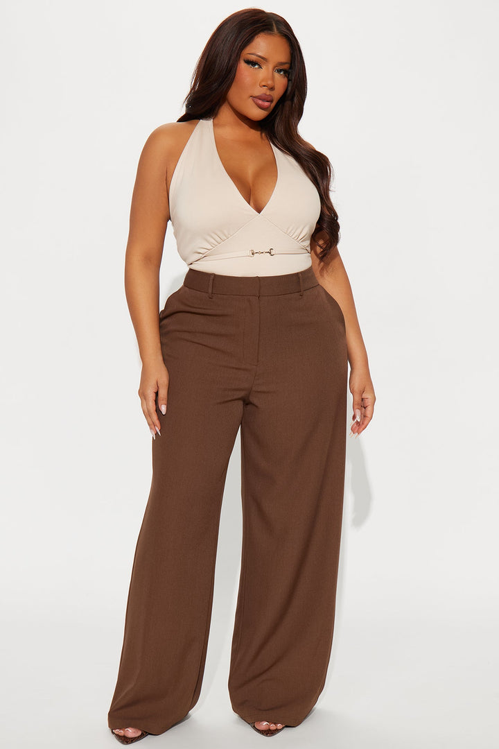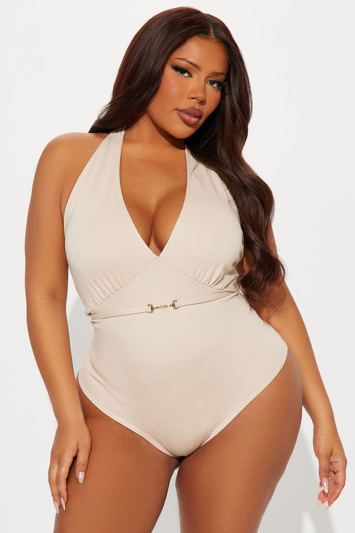 Available In Black And Taupe. | Halter Bodysuit | Final Sale | Stretch | Tie Neck | Ruched Bust Detail | Seaming | Hardware Detail | Cheeky Bottom | Snap Closure | Self: 68% Rayon 28% Nylon 4% Spandex | Lining: 100% Polyester | Imported
