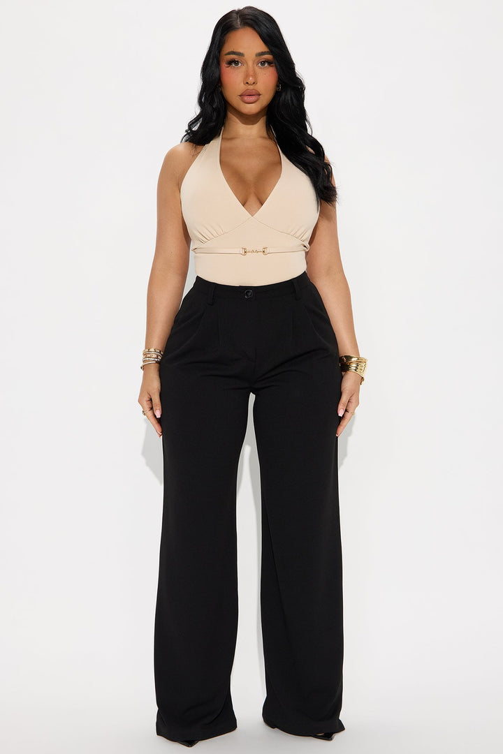 Available In Black And Taupe. | Halter Bodysuit | Final Sale | Stretch | Tie Neck | Ruched Bust Detail | Seaming | Hardware Detail | Cheeky Bottom | Snap Closure | Self: 68% Rayon 28% Nylon 4% Spandex | Lining: 100% Polyester | Imported