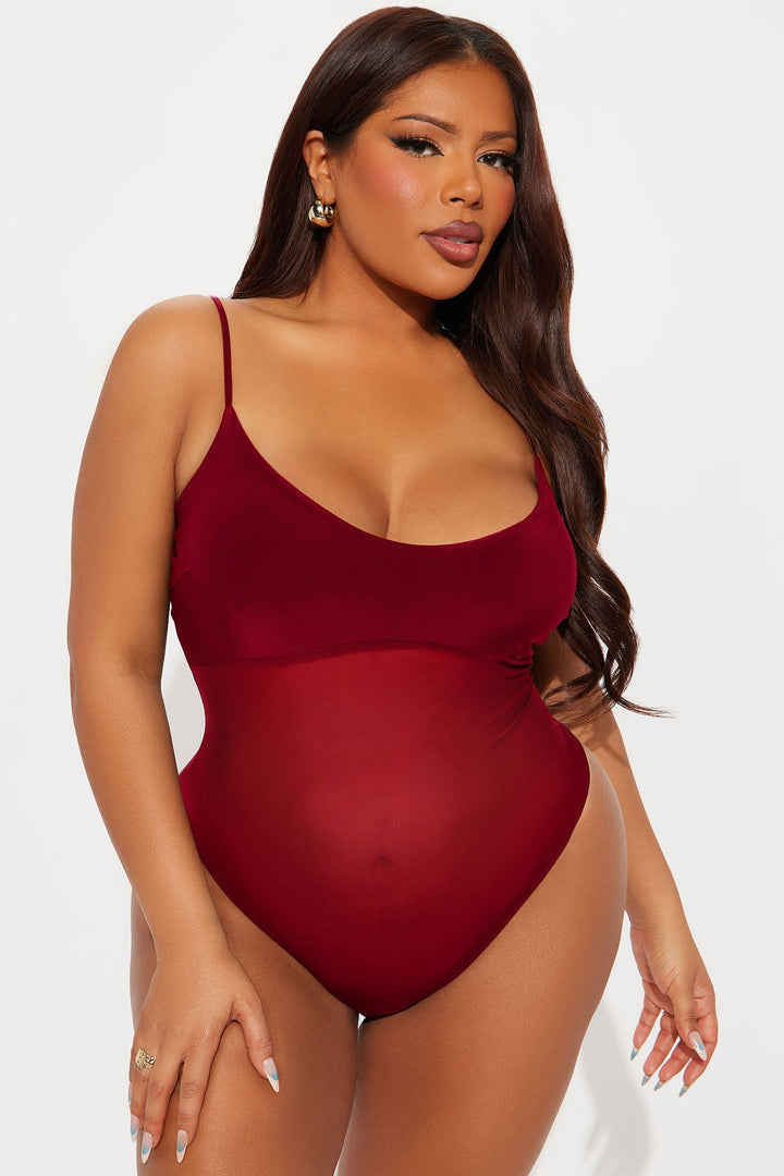 Available In Mocha, Red And White. | Mesh Bodysuit | Adjustable Straps | Seaming | Sheer | Cheeky Bottom | Snap Closure | Stretch | Final Sale | Self: 95% Polyester 5% Spandex | Contrast: 95% Polyester 5% Spandex | Imported