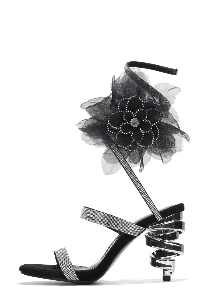 CANDRA - BLACK - HEELS by CAPE ROBBIN Heel: 3.5 inch Wrap around strappy heel PU Leather insole with memory foam cushioning for added comfort Rhinestone embelished on flower decor Round toe Chrome finish swirl heel The Candra heels are designed to make you the center of attention at any event. These stunning sandals feature sparkling rhinestone-encrusted straps that elegantly wrap around your ankles,adding a touch of sophistication and glamour to your look. The unique spiral heel design is a true statement piece,providing a bold and stylish twist to classic stiletto heels.\
