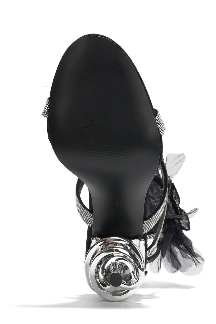 CANDRA - BLACK - HEELS by CAPE ROBBIN Heel: 3.5 inch Wrap around strappy heel PU Leather insole with memory foam cushioning for added comfort Rhinestone embelished on flower decor Round toe Chrome finish swirl heel The Candra heels are designed to make you the center of attention at any event. These stunning sandals feature sparkling rhinestone-encrusted straps that elegantly wrap around your ankles,adding a touch of sophistication and glamour to your look. The unique spiral heel design is a true statement piece,providing a bold and stylish twist to classic stiletto heels.\