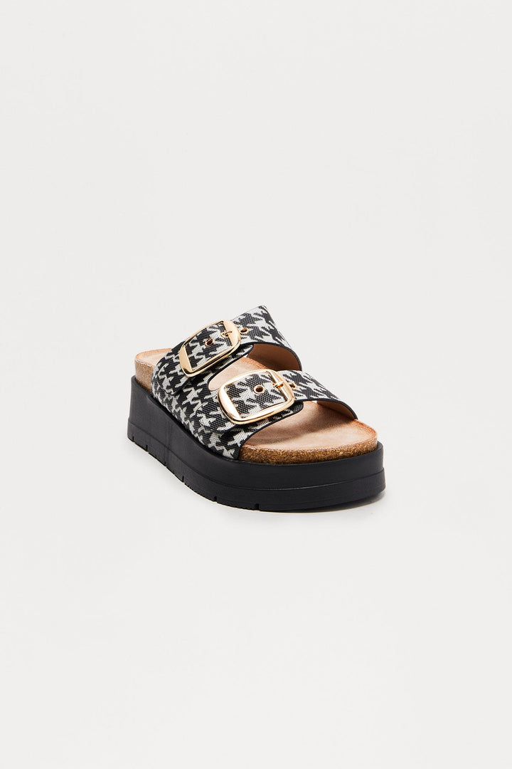 Available In Black/White And Tan/Multi. | Flat Sandals | Chevron Print | Buckle Detail | Round Toe | 1.25" Platform Heel | Imported