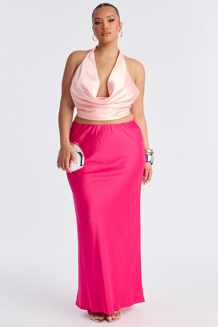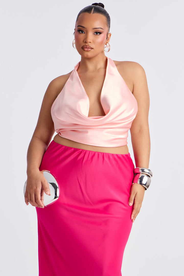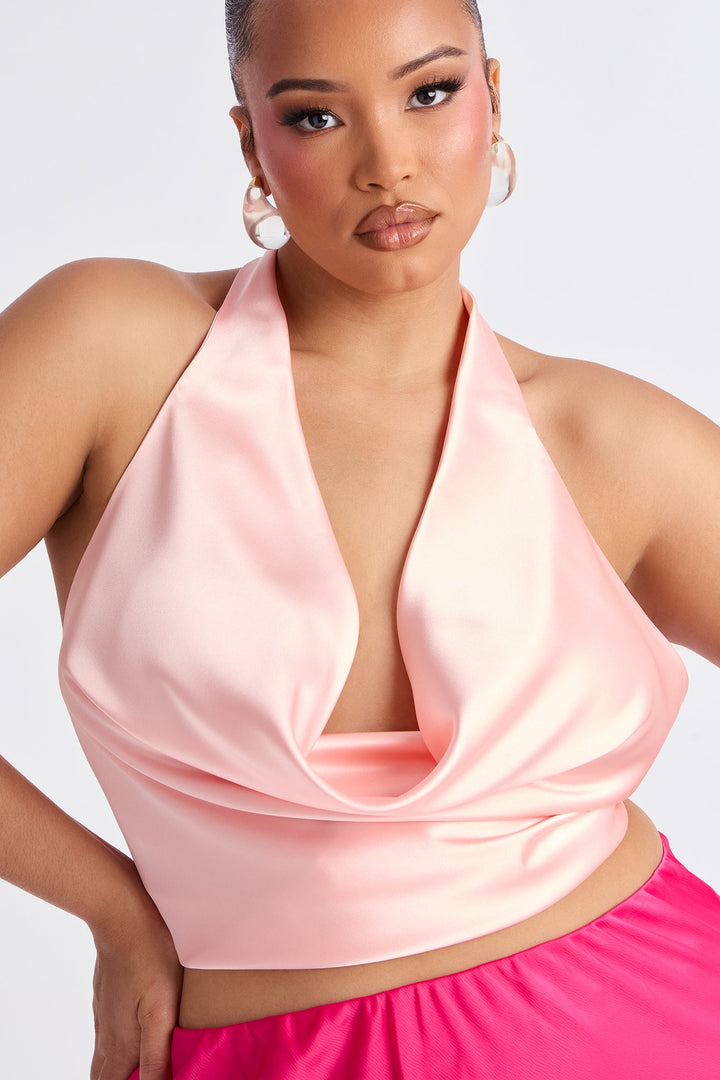Available In Black, Cream, Emerald And Pink. | Halter Top | Tie Neck | Cowl Neck | Backless | Tie Back | Stretch | 97% Polyester 3% Spandex | Imported