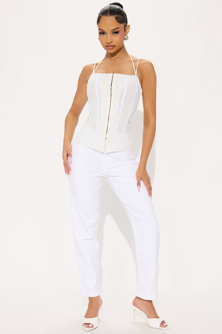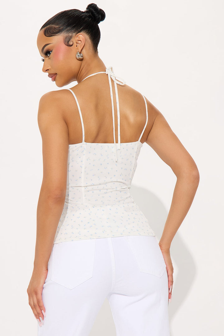 Available In White/combo. | Ribbed Top | Stretch | Halter Detail | Tie Neck | Spaghetti Straps | Lace Trim | Hook And Eye Front Closure | Seaming | Disclaimer : Due To The Printing Process, Each Garment Is Unique | 94% Polyester 6% Spandex | Imported