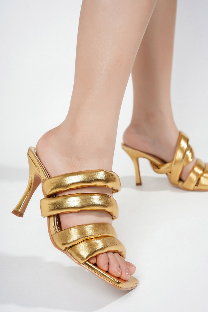 CARLENE - GOLD - HEELS by CAPE ROBBIN Sculpted heel: 3-inch Slip on PU Leather insole with memory foam cushioning for added comfort Oversize padded straps Square toe Meet luxurious elegance with the Carlene Metallic Slip-On Heel Sandals. These chic sandals feature a bold metallic finish with padded straps, designed to add a touch of luxury to any outfit, making them a must-have for the modern fashionista. Whether you're heading to a gala or a night out on the town, these heels will ensure you shine with every step.