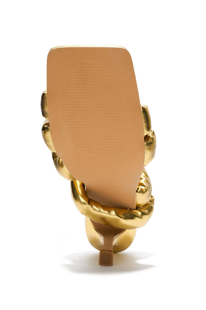 CARLENE - GOLD - HEELS by CAPE ROBBIN Sculpted heel: 3-inch Slip on PU Leather insole with memory foam cushioning for added comfort Oversize padded straps Square toe Meet luxurious elegance with the Carlene Metallic Slip-On Heel Sandals. These chic sandals feature a bold metallic finish with padded straps, designed to add a touch of luxury to any outfit, making them a must-have for the modern fashionista. Whether you're heading to a gala or a night out on the town, these heels will ensure you shine with every step.
