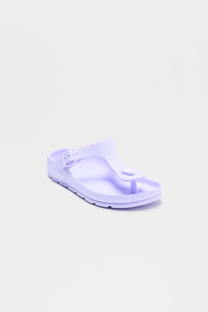 Available In Black, Grey, Lavender, Pink And White. | Flat Sandals | Flip Flops | Buckle Detail | Round Toe | Flat Heel | Imported
