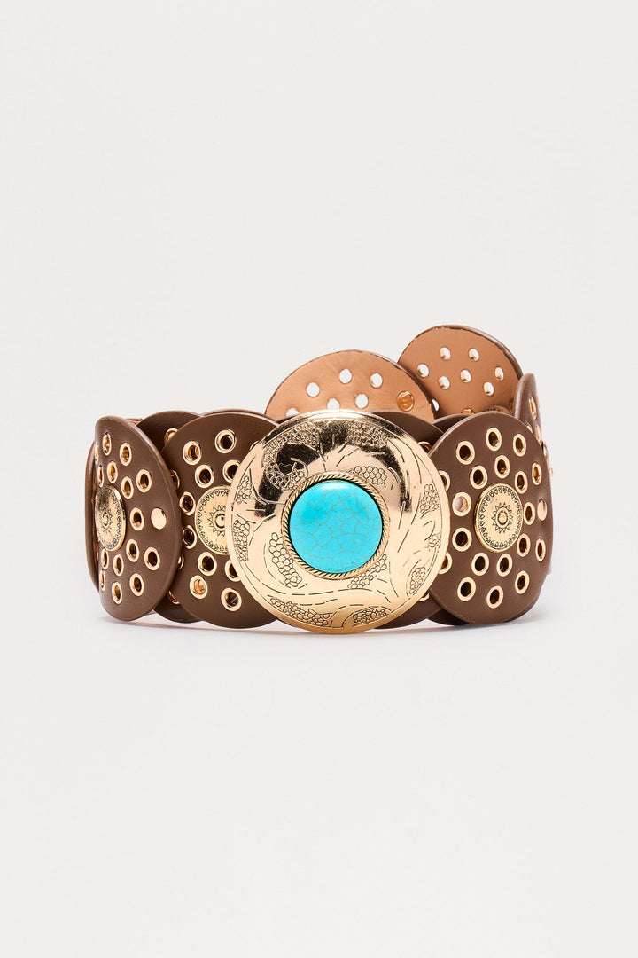Available In Brown/combo. | Wide Belt | Metal Disc Detail | Hardware Detail | Circular Buckle | Faux Leather Material | Length: 44.5" | Imported
