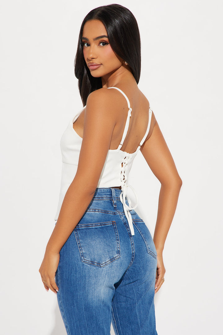 Available In Off White. | High Neck Top | Stretch | Lace Up Back | Seaming | 70% Rayon 25% Nylon 5% Spandex | Imported