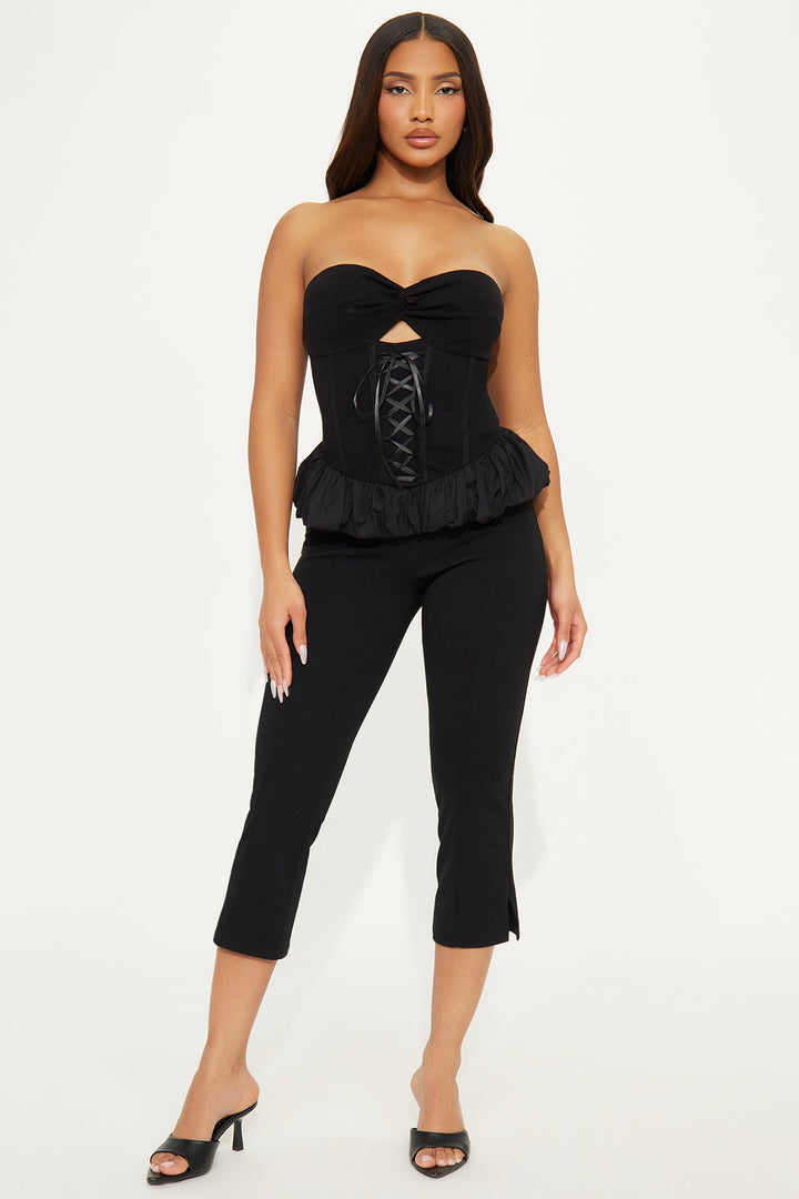 Available In Black. | Strapless Top | Cut Out Detail | Lace Up Detail | Back Zipper | Stretch | Bubble Hem | Shell1: 93% Rayon 7% Spandex | Shell2: 60% Cotton 35% Nylon 5% Spandex | Imported