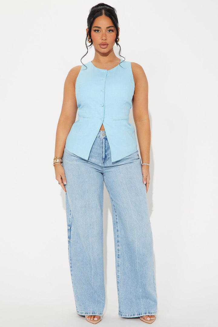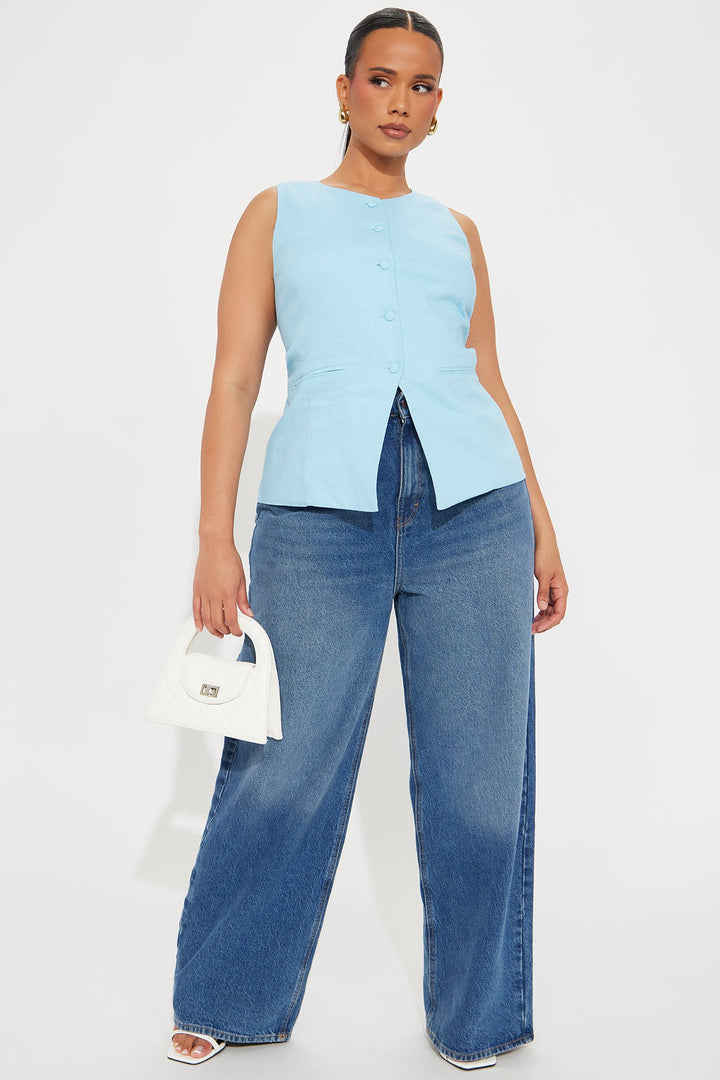 Available In Light Blue. | Linen Vest Top | Sleeveless | Crew Neck | Button Down | Open Front | Pocket Details | Non Stretch | Self: 55% Linen 45% Rayon Lining: 100% Polyester | Imported