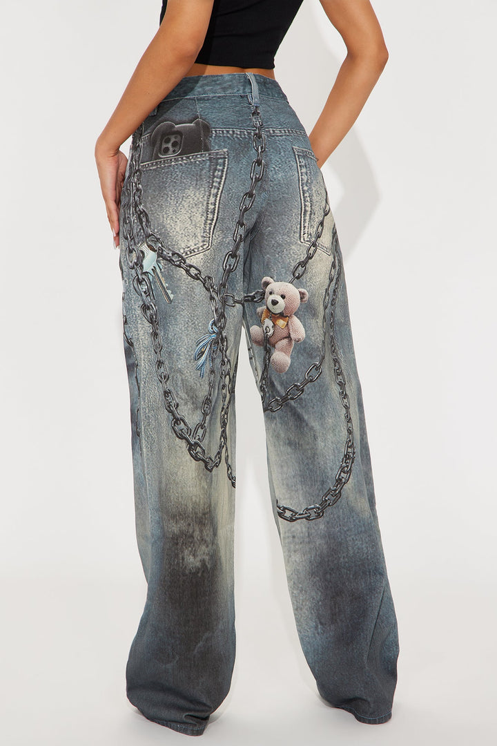 Available In Medium Wash. | Front Pockets | Wide Leg Jean | Novelty Print | 100% Cotton | 11" Rise | 33.5" Inseam | Disclaimer: Due To The Specialized Wash Process, Each Garment Is Unique. | Self: 100% Cotton | Imported