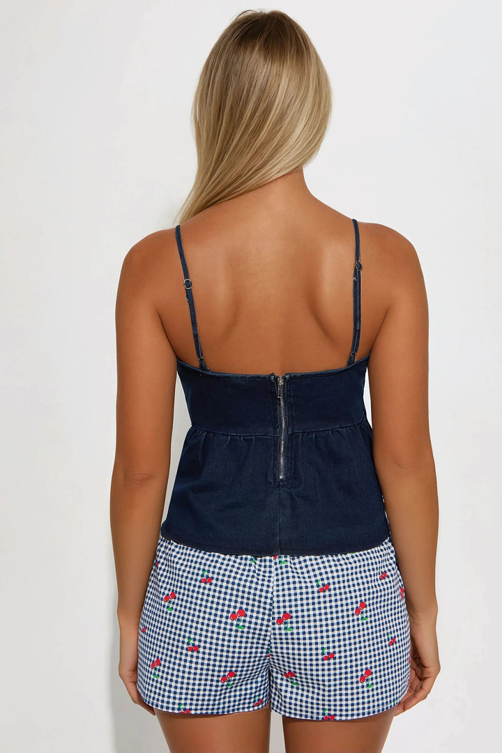 Available In Dark Wash. | Denim Top | Stretch | Adjustable Spaghetti Straps | Self: 75% Cotton 23% Polyester 2% Spandex | Imported
