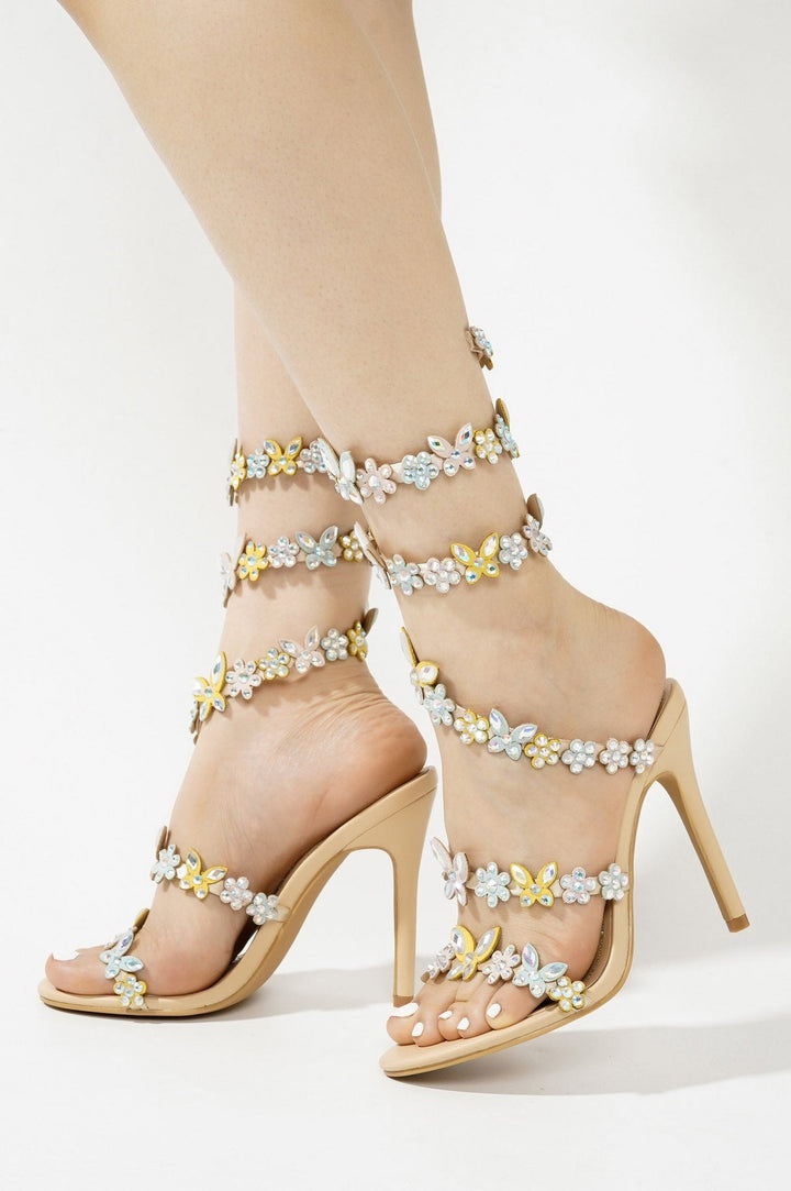 CHASTITY - BEIGE - HEELS by CAPE ROBBIN Stiletto heel: 4.25-inch Wrap around strappy style PU leather insole with memory foam for added comfort Rhinestone embellished butterfly and flow Round toe Step out in the Chastity Rhinestone Floral Embellished Stiletto High Heel Sandals and enjoy the perfect blend of beauty and elegance. These sandals will not only complement your most glamorous outfits but also add a touch of magic to your every step. Stunning floral embellishments that capture the light and everyone's attention, perfect for those special evenings or any event where making a memorable entrance is a must.