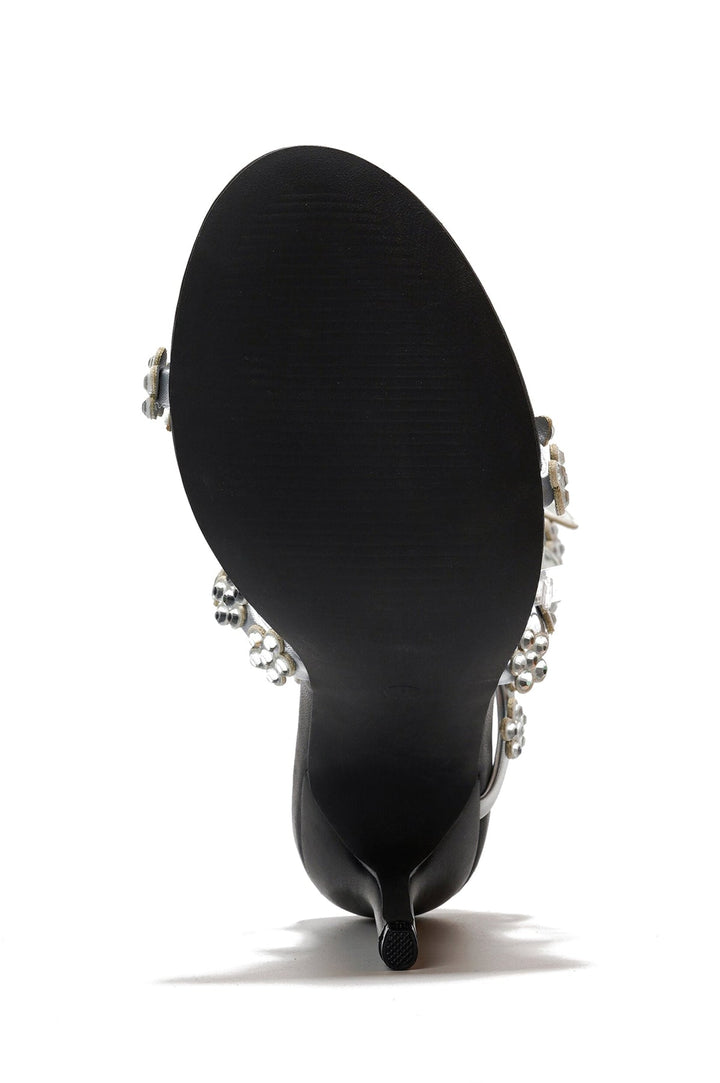 CHASTITY - BLACK - HEELS by CAPE ROBBIN Stiletto heel: 4.25-inch Wrap around strappy style PU leather insole with memory foam for added comfort Rhinestone embellished butterfly and flow Round toe Step out in the Chastity Rhinestone Floral Embellished Stiletto High Heel Sandals and enjoy the perfect blend of beauty and elegance. These sandals will not only complement your most glamorous outfits but also add a touch of magic to your every step. Stunning floral embellishments that capture the light and everyone's attention, perfect for those special evenings or any event where making a memorable entrance is a must.