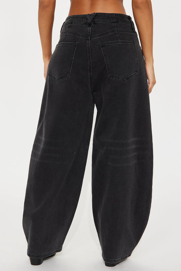 Available In Black And Black Wash. | Barrel Leg Jean | 5 Pocket | Loose Fit | 13" Rise | 27.5" Inseam | Low Stretch | Disclaimer Due To The Specialized Wash Process, Each Garment Is Unique. | 64% Cotton 23.5% Polyester 12% Viscose 0.5% Viscose | Imported