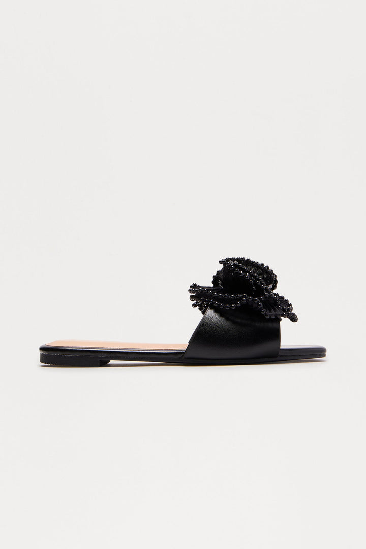 Available In Black, Nude And White. | Flat Sandals | Pearl Detail | Ruffle 3D Applique | Square Toe | Flat Heel | Imported