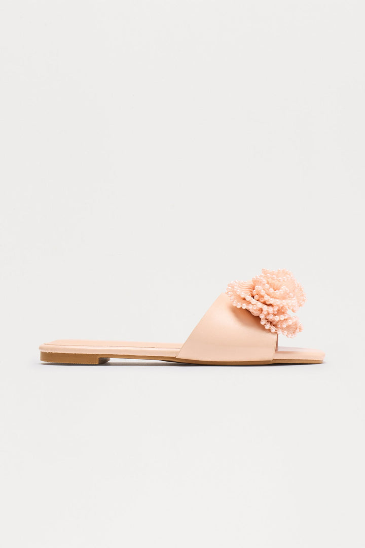 Available In Black, Nude And White. | Flat Sandals | Pearl Detail | Ruffle 3D Applique | Square Toe | Flat Heel | Imported