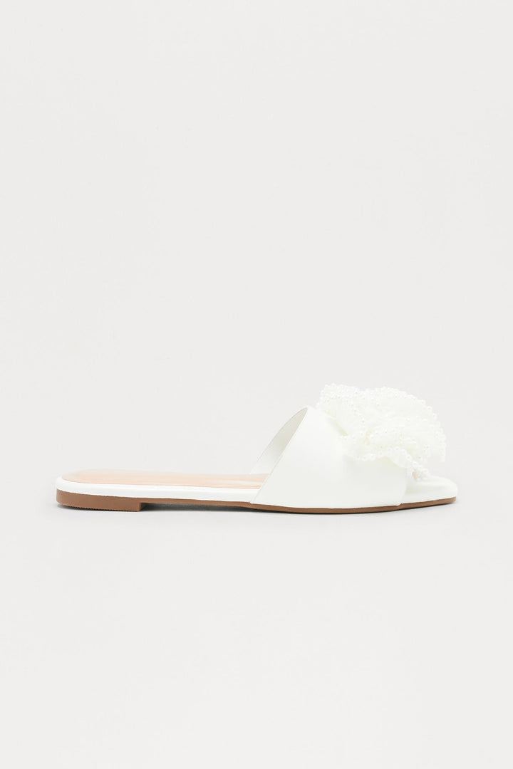 Available In Black, Nude And White. | Flat Sandals | Pearl Detail | Ruffle 3D Applique | Square Toe | Flat Heel | Imported