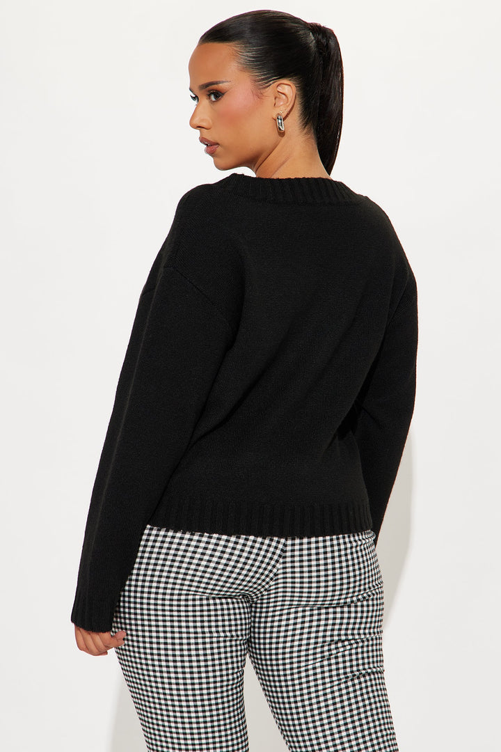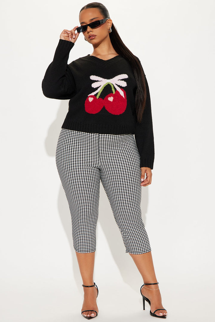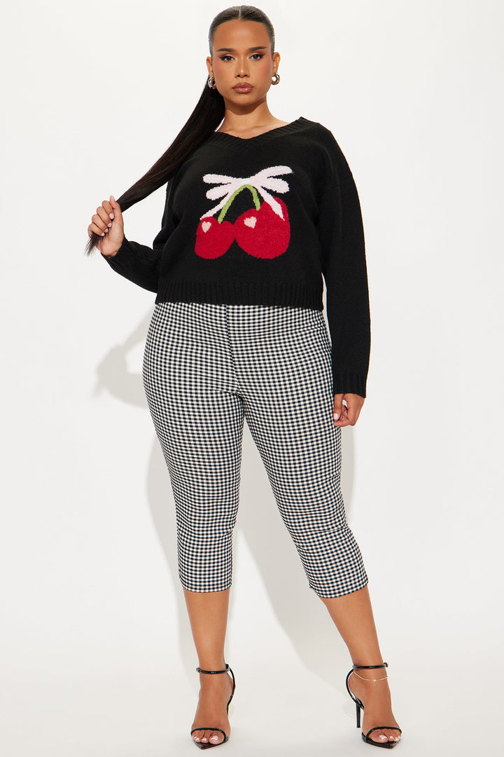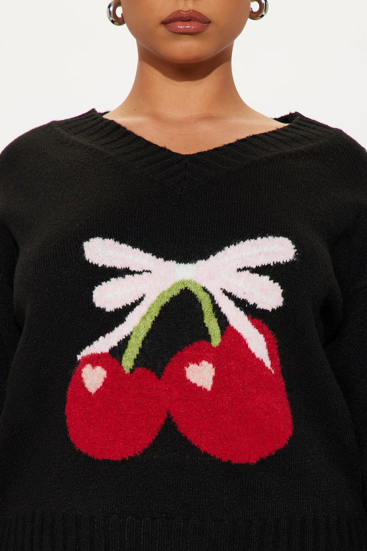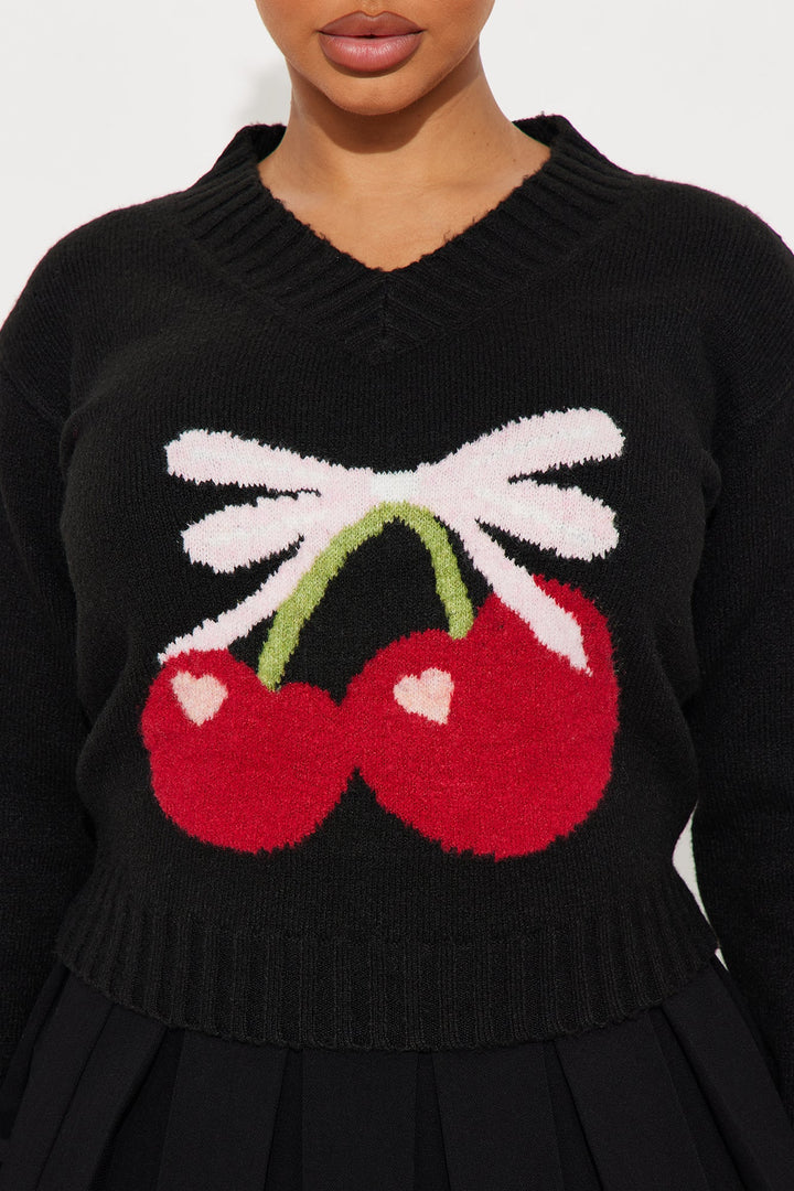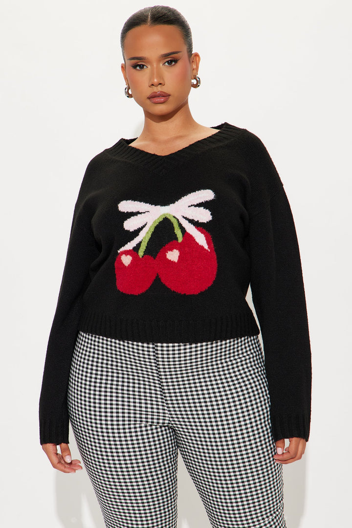 Available In Black/combo. | Pullover Sweater | Cherry Bow Graphic | Long Sleeve | V Neck | Ribbed Hem | 74% Acrylic 22% Polyester 4% Elastane | Imported