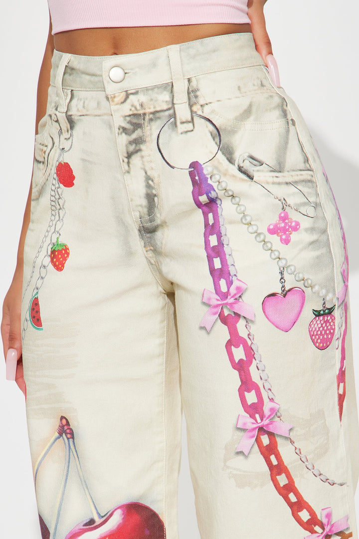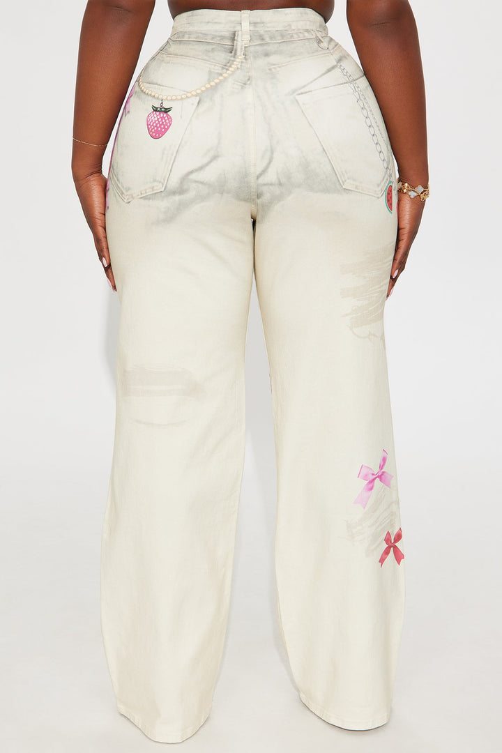 Cherry On Top Printed Wide Leg Jeans - Ivory