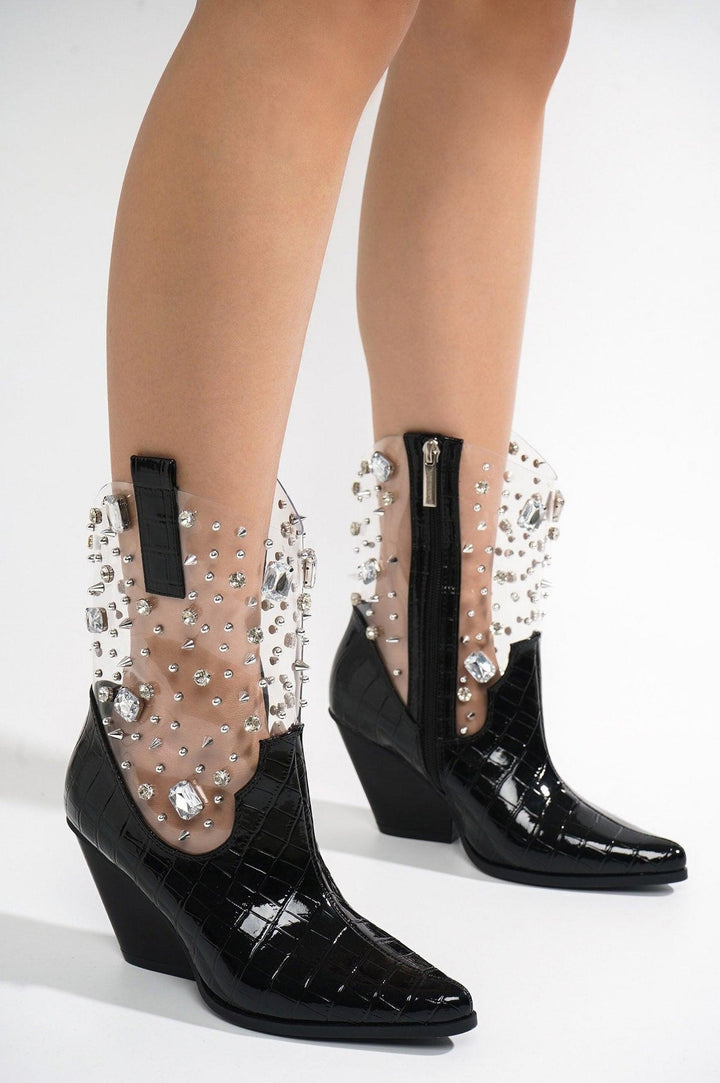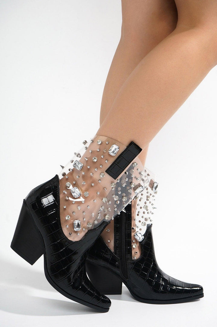 CHRIENA - BLACK - BOOTIES by CAPE ROBBIN zipper closure clear shaft finish covered in rhinestone and gem wooden mid block heel croc finish upper and pull straps Chriena booties will add a sparkle of glam to your look! These stylish shoes are the perfect combination of chic and glam and will give line dancing a fresh twist.