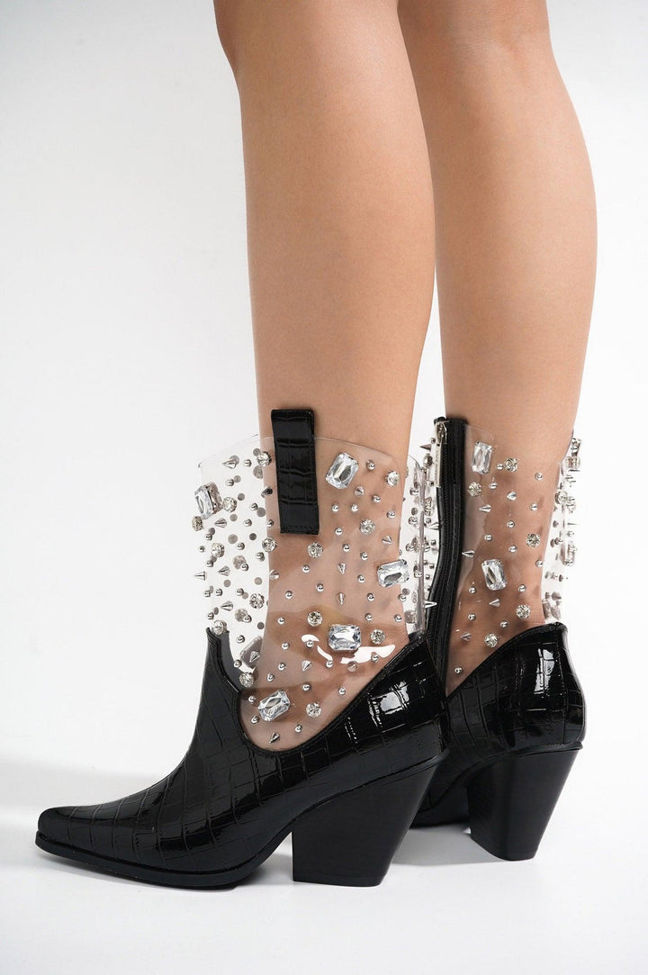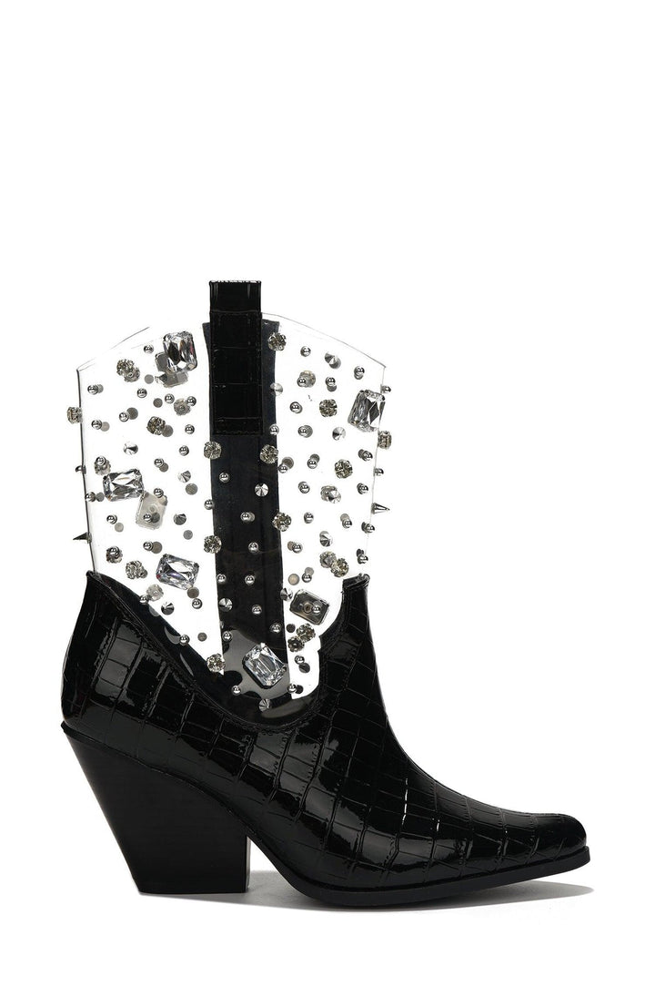 CHRIENA - BLACK - BOOTIES by CAPE ROBBIN zipper closure clear shaft finish covered in rhinestone and gem wooden mid block heel croc finish upper and pull straps Chriena booties will add a sparkle of glam to your look! These stylish shoes are the perfect combination of chic and glam and will give line dancing a fresh twist.