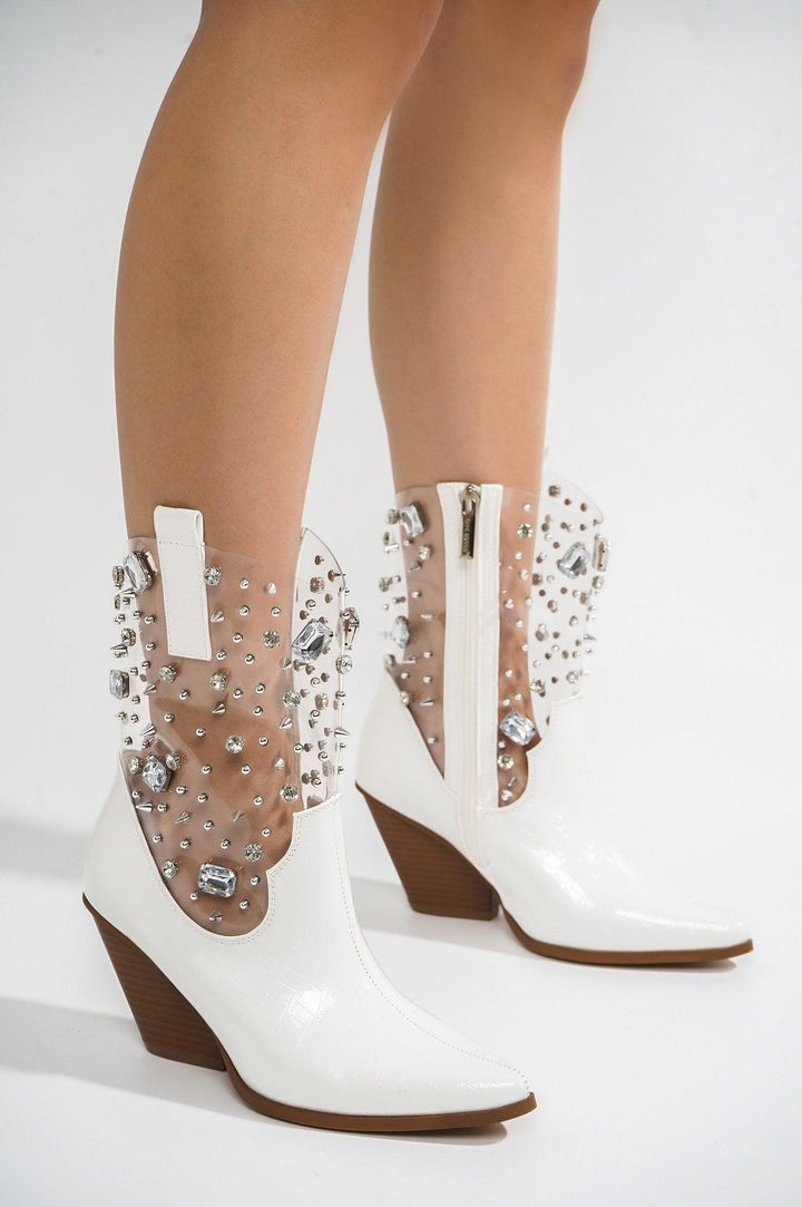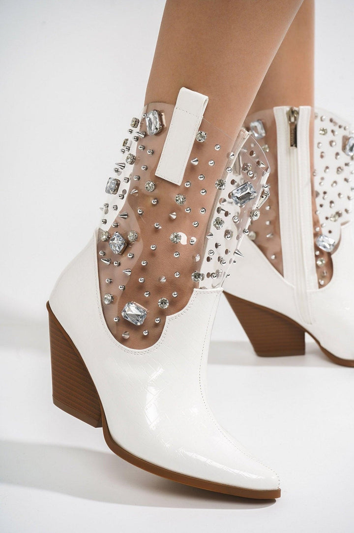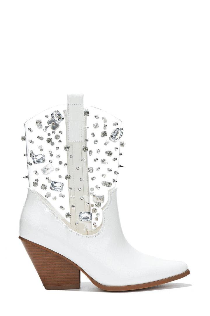 CHRIENA - WHITE - BOOTIES by CAPE ROBBIN zipper closure clear shaft finish covered in rhinestone and gem wooden mid block heel croc finish upper and pull straps Chriena booties will add a sparkle of glam to your look! These stylish shoes are the perfect combination of chic and glam and will give line dancing a fresh twist.