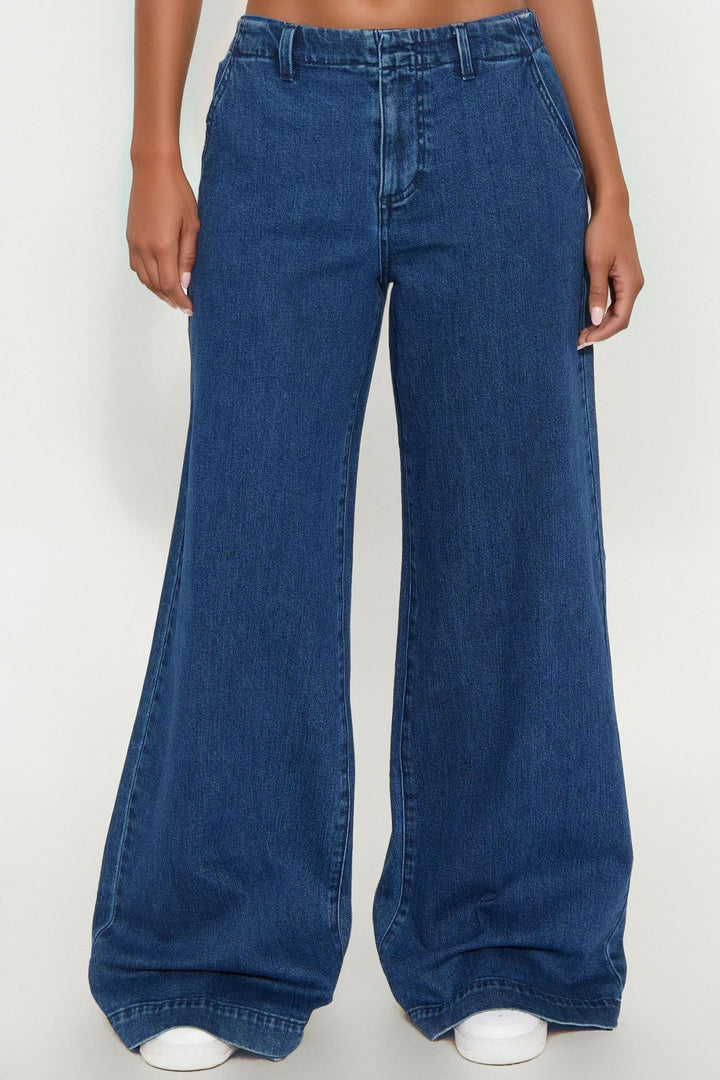 Available In Dark Wash. | Wide Leg Jean | Trouser Pockets | Zipper Fly | Hook And Eye Closure | Elasticized Back Waistband | 11.5" Rise | 33" Inseam | Low Stretch | Disclaimer Due To The Specialized Wash Process, Each Garment Is Unique. | 99% Cotton 1% Spandex | Imported