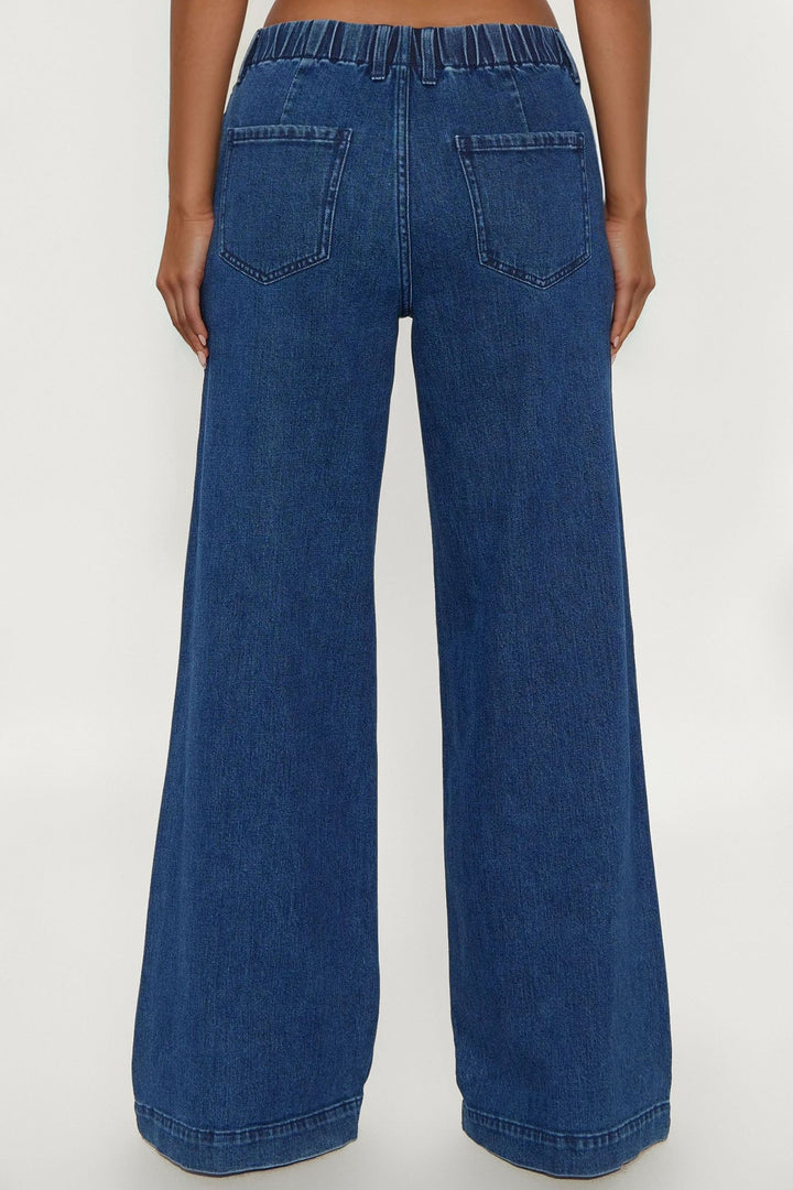 Available In Dark Wash. | Wide Leg Jean | Trouser Pockets | Zipper Fly | Hook And Eye Closure | Elasticized Back Waistband | 11.5" Rise | 33" Inseam | Low Stretch | Disclaimer Due To The Specialized Wash Process, Each Garment Is Unique. | 99% Cotton 1% Spandex | Imported
