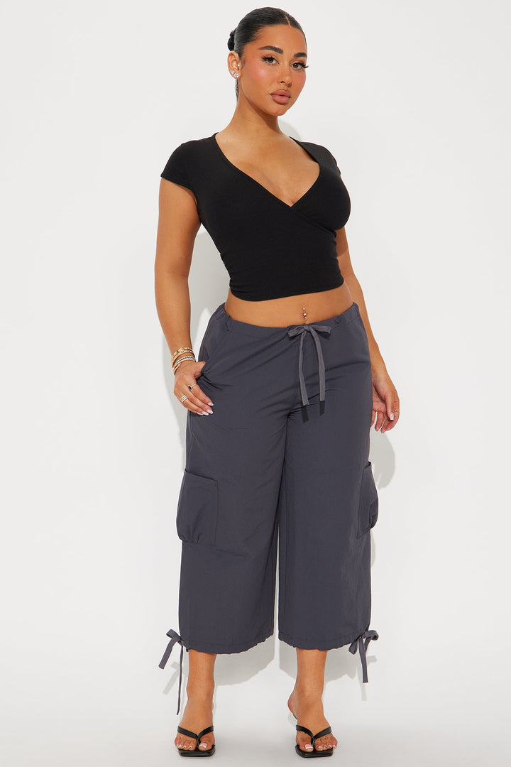 Available In Black And Mocha. | Surplice Top | Stretch | Short Sleeve | Ribbed | Cropped | 60% Cotton 35% Polyester 5% Spandex | Imported
