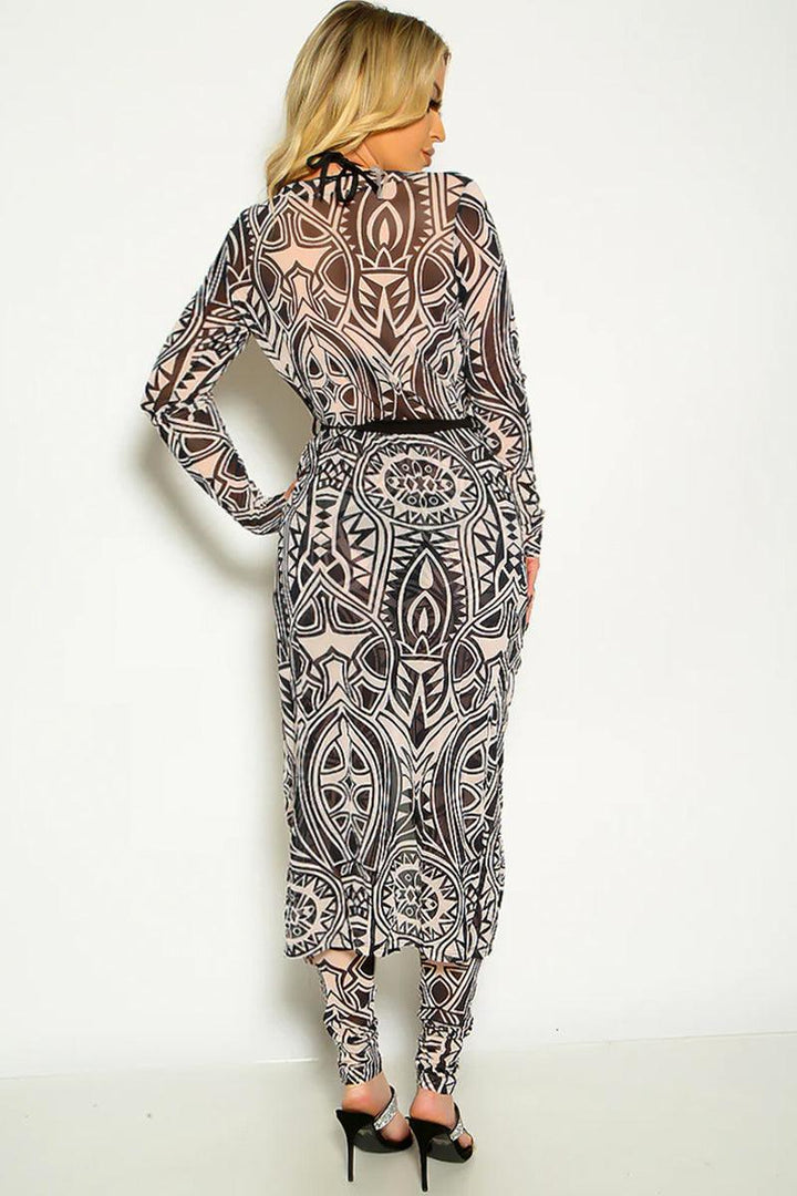 Beige Black Open Front Long Sleeve Swimsuit Kimono 2 Pc Coverup