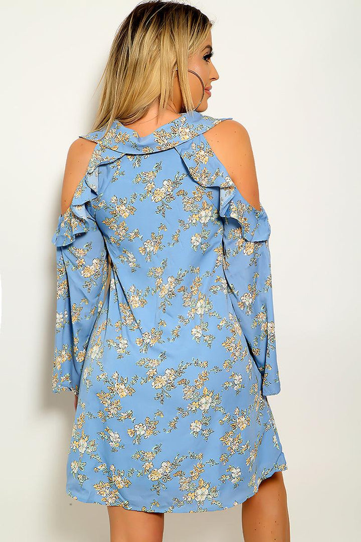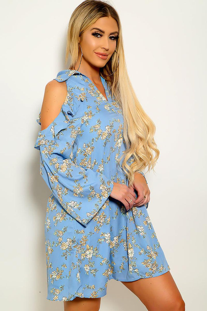 Sexy Blue Floral Cold Shoulder Ruffle Dress