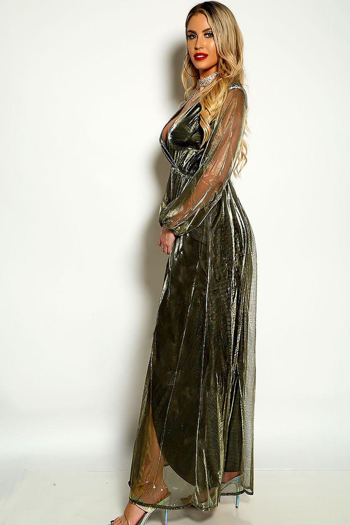 This is the perfect dress for a night out! Featuring; Long Sleeve, mesh, shimmer, v-cut neck line, side slit. Followed by a fitted wear. 90% polyester 10% spandex