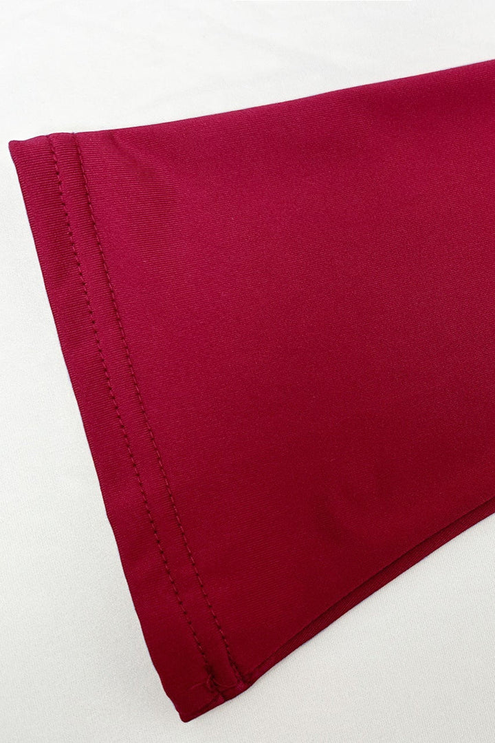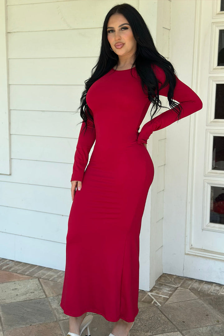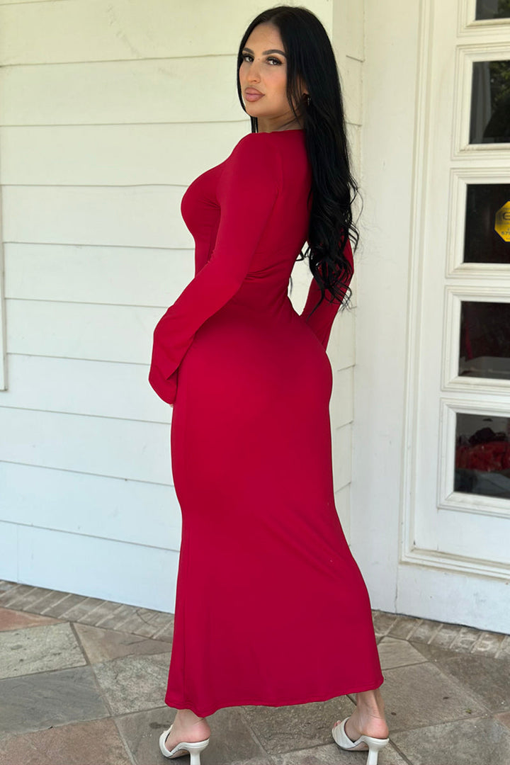 Wine Long Bell Sleeves Fitted Flare Fleece Long Maxi Party Dress