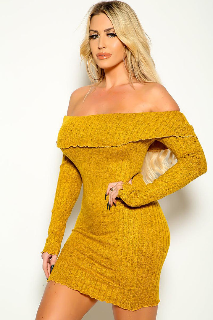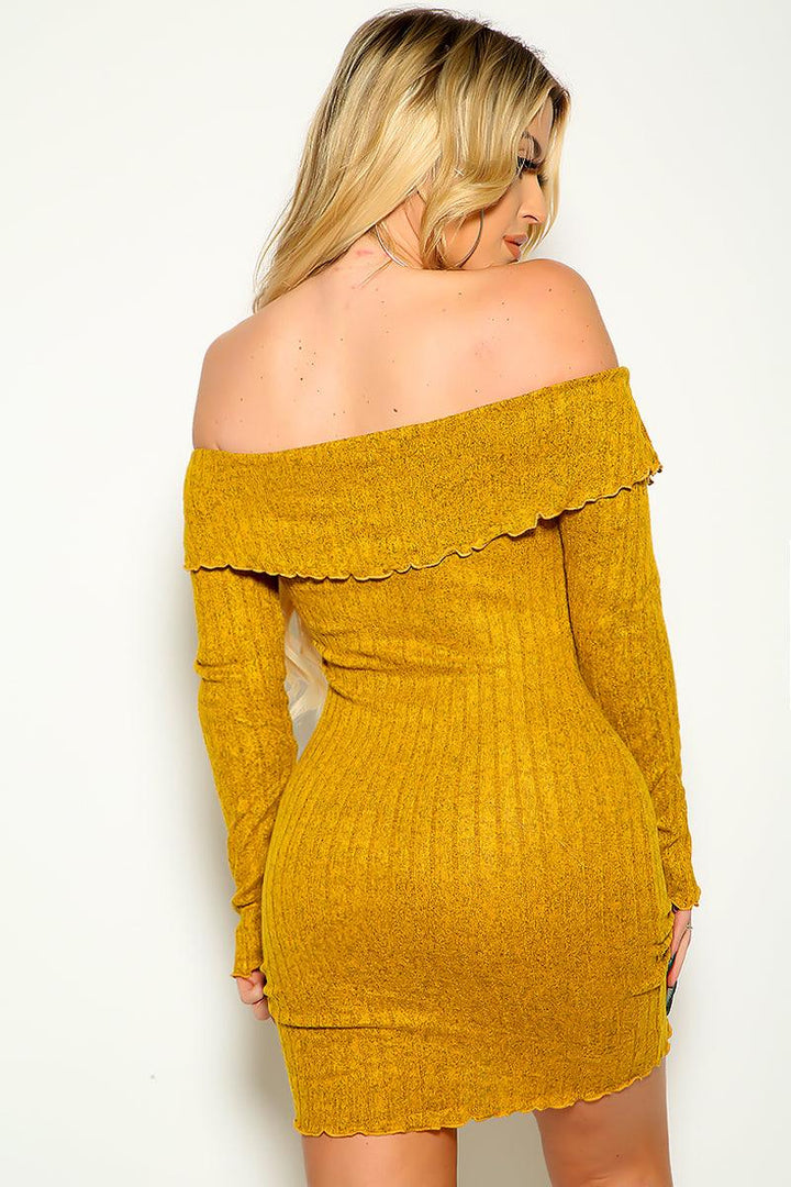 Mustard Off Shoulder Wavy Trim Sexy Sweater Dress