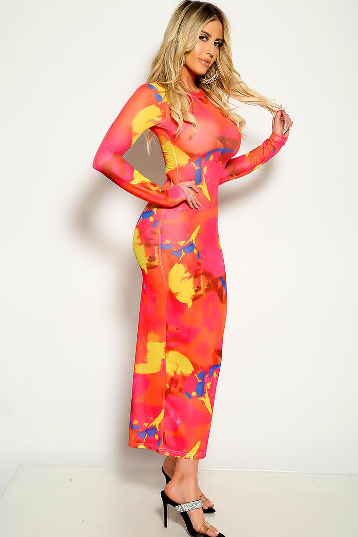Orange Multi Mesh Long Sleeve Maxi Dress