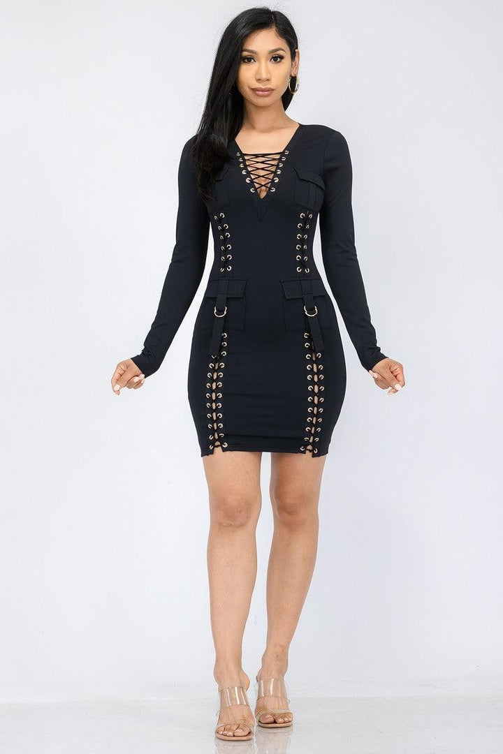 Long sleeve, V neck, Criss cross lace up, 4 front flap pockets, Bodycon 82% Polyester 18% Spandex. Made In: USA.