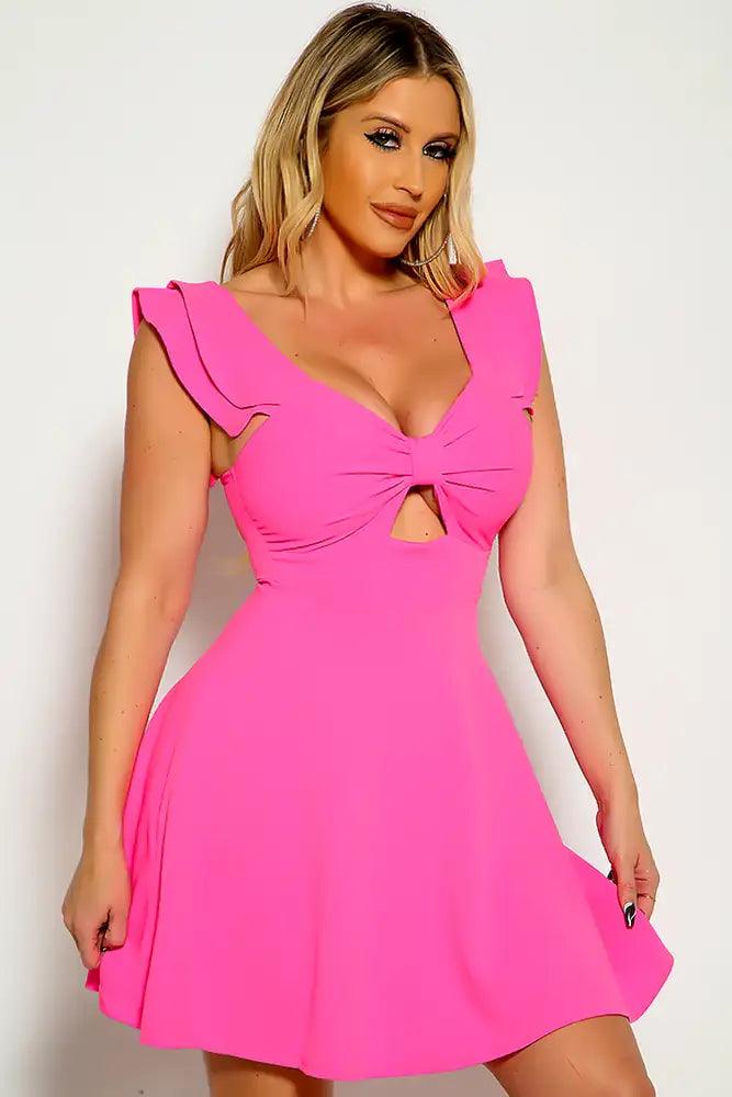 Hot Pink Ruffle Sleeve Key Hole A-Line Dress