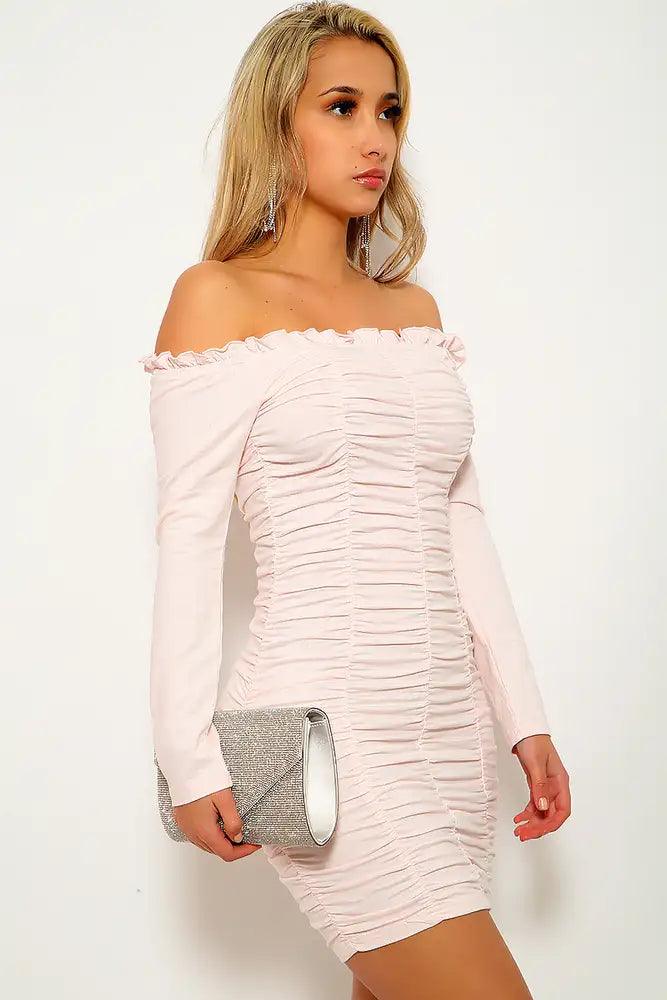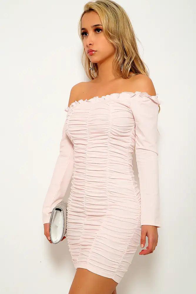 Dress to impress in this sexy bold party dress! Featuring; long sleeve, off the shoulder, ruched, ruffled detail. Followed by a fitted wear. 95% Polyester, 5% Spandex.