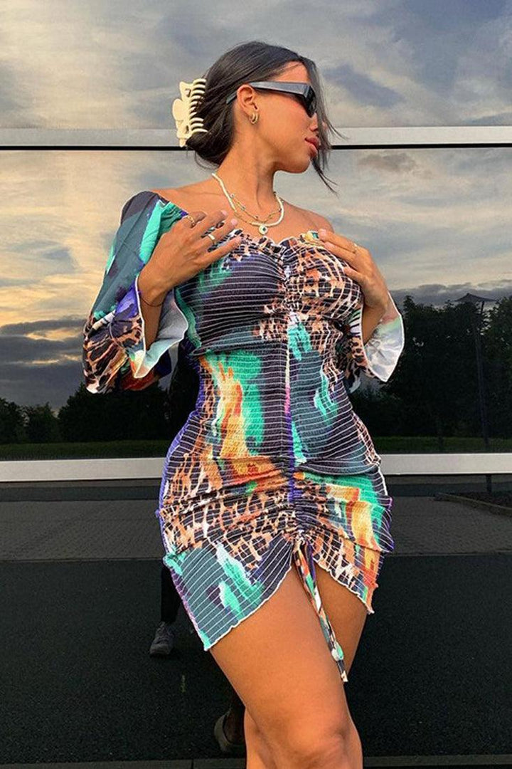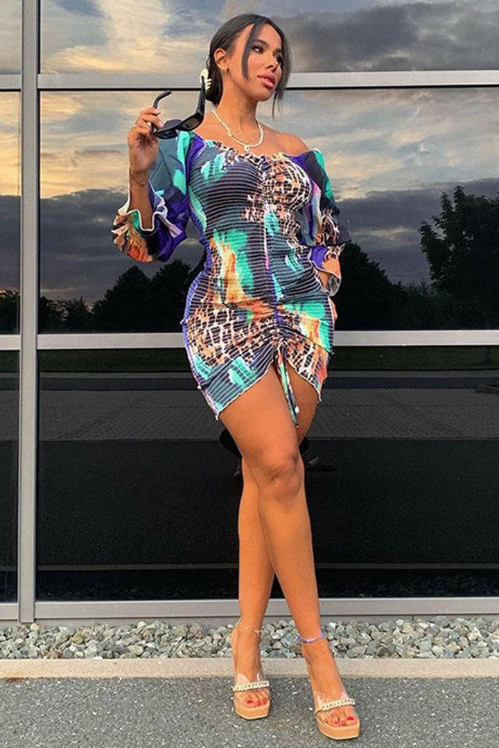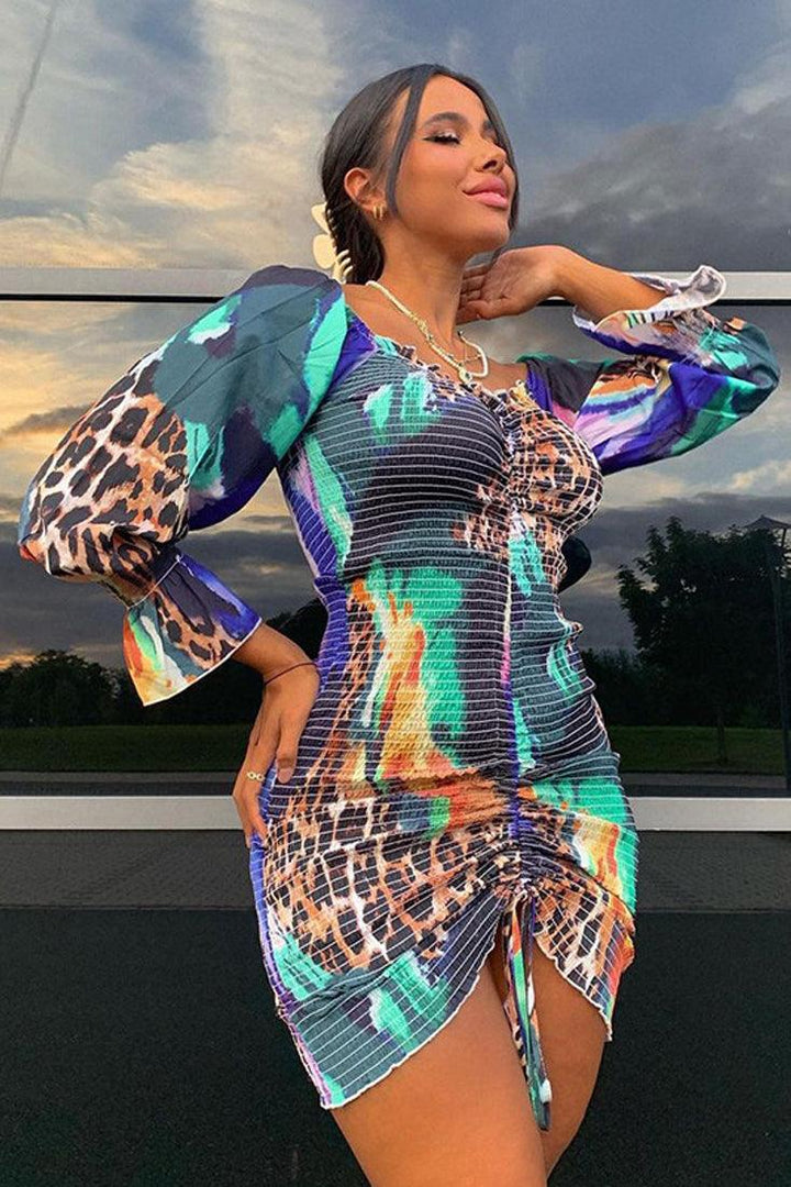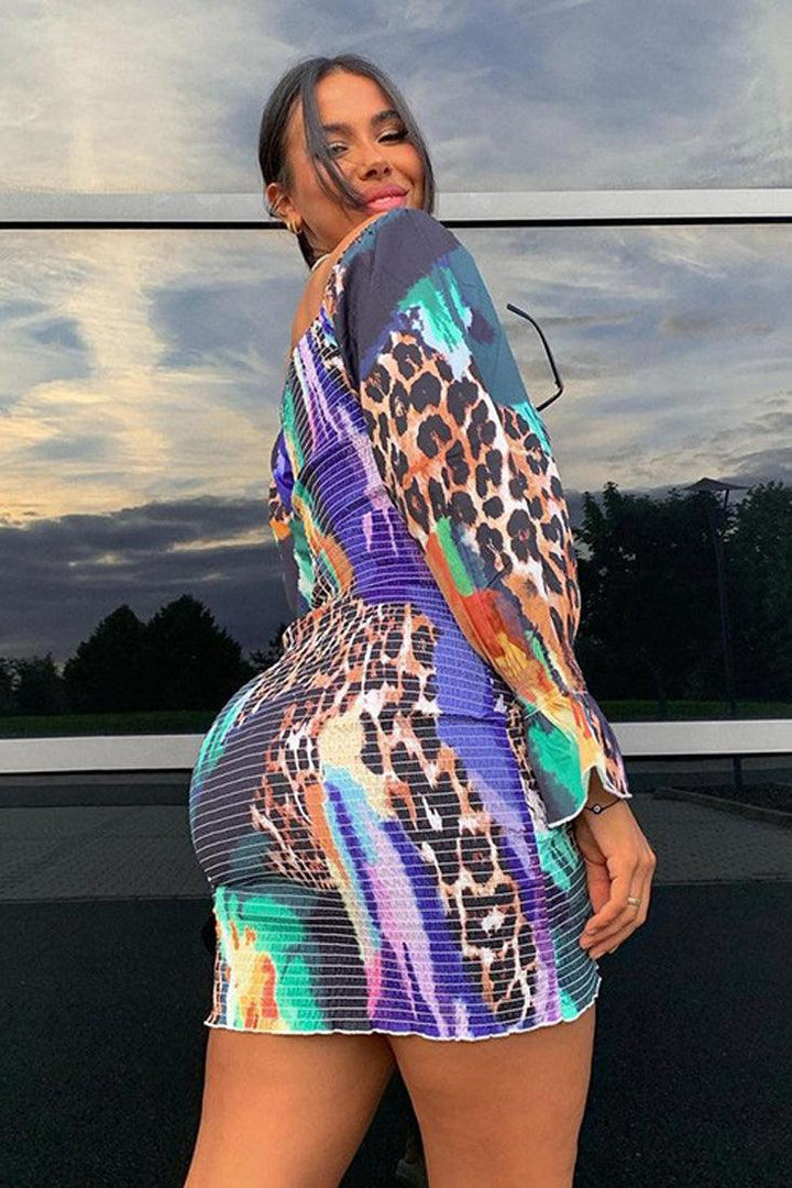 Sexy Multi Colored Long Sleeve Club Dress With Leopard Detail