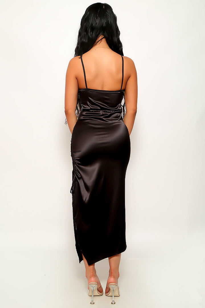 Black Satin Spaghetti Straps Drawstring Midi Slit Sexy Party Dress